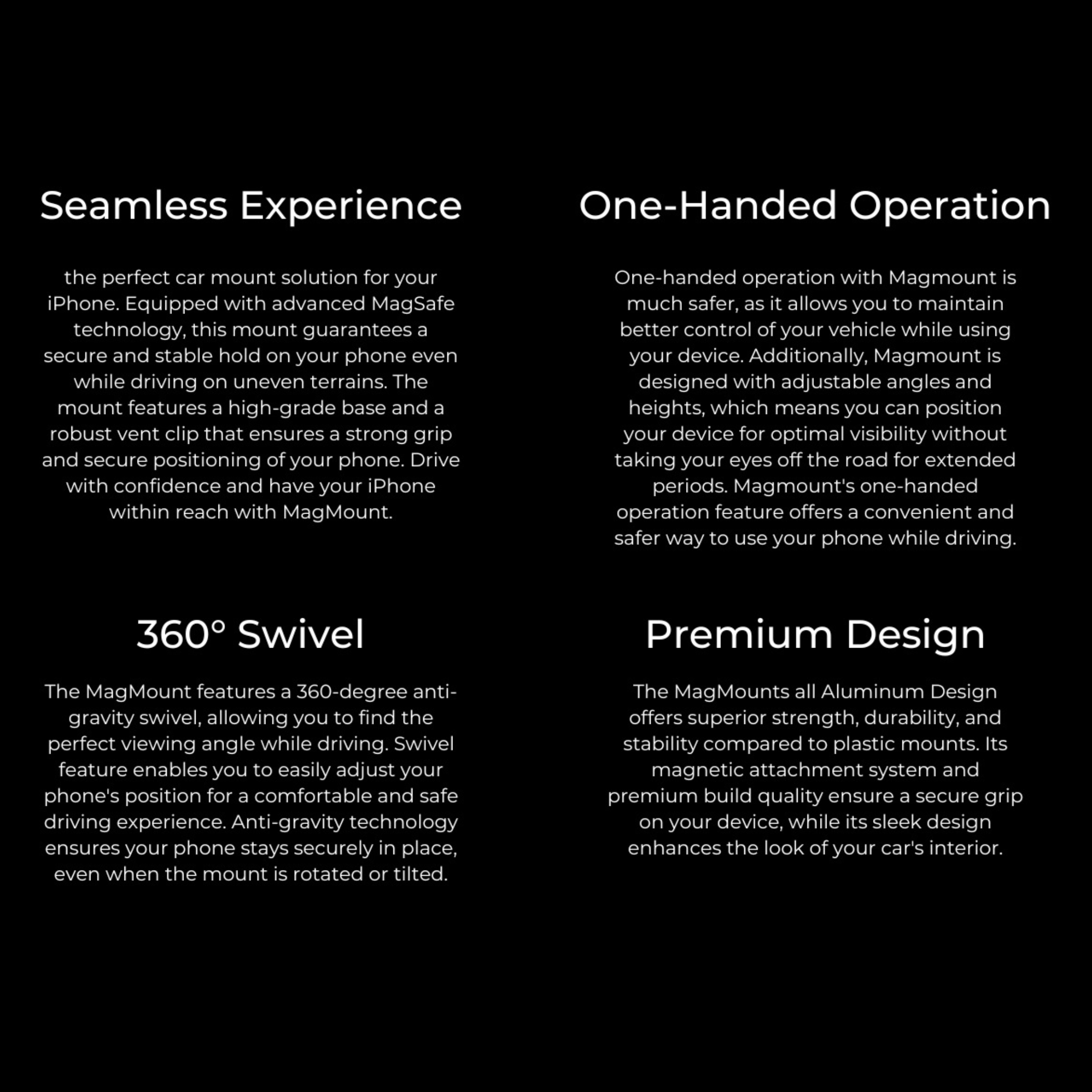 The MagMount v4 is like no other carmount out there! With its stainless steel ball hinge design, 360 swivel, zero-plastic components, it will not only charge and keep your phone safe, it will look good while doing it as well!
